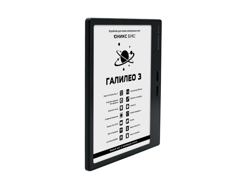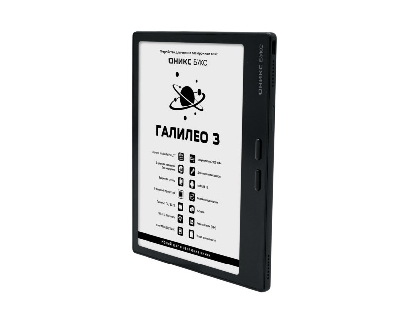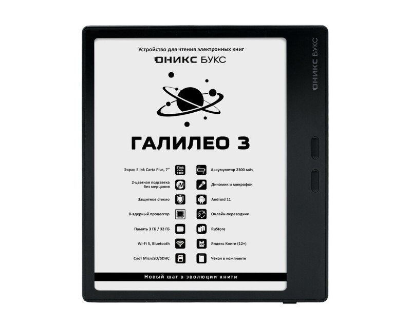 ОНИКС БУКС Галилео 3 — 7-дюймовый ридер с экраном высокого разрешения E Ink Carta Plus (Carta 1300) с подсветкой и сенсорным управлением. Устройство базируется на высокопроизводительном 8-ядерном процессоре и имеет увеличенную до 3 ГБ оперативную память. Модель работает под управлением операционной системы Android 11 и позволяет устанавливать и использовать дополнительные приложения. Для этого на ридере предустановлены магазины приложений Google Play и RuStore. ОНИКС БУКС Галилео 3 оснащен модулями Wi-Fi и Bluetooth, а 32 гигабайта встроенной памяти в сочетании со слотом microSD позволяют хранить большое количество книг и документов непосредственно на устройстве. Предустановленный аудиоплеер дает возможность прослушивать аудиокниги и музыку через встроенный динамик или наушники. Ридер выполнен в тонком компактном корпусе, а экран модели дополнительно закрыт защитным стеклом. Кнопки управления на боковой стороне были доработаны и стали еще удобнее для пользователей. В комплекте с устройством поставляется «умная» защитная обложка.