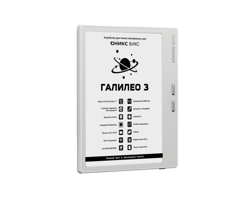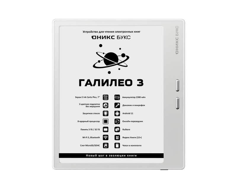 ОНИКС БУКС Галилео 3 — 7-дюймовый ридер с экраном высокого разрешения E Ink Carta Plus (Carta 1300) с подсветкой и сенсорным управлением. Устройство базируется на высокопроизводительном 8-ядерном процессоре и имеет увеличенную до 3 ГБ оперативную память. Модель работает под управлением операционной системы Android 11 и позволяет устанавливать и использовать дополнительные приложения. Для этого на ридере предустановлены магазины приложений Google Play и RuStore. ОНИКС БУКС Галилео 3 оснащен модулями Wi-Fi и Bluetooth, а 32 гигабайта встроенной памяти в сочетании со слотом microSD позволяют хранить большое количество книг и документов непосредственно на устройстве. Предустановленный аудиоплеер дает возможность прослушивать аудиокниги и музыку через встроенный динамик или наушники. Ридер выполнен в тонком компактном корпусе, а экран модели дополнительно закрыт защитным стеклом. Кнопки управления на боковой стороне были доработаны и стали еще удобнее для пользователей. В комплекте с устройством поставляется «умная» защитная обложка.